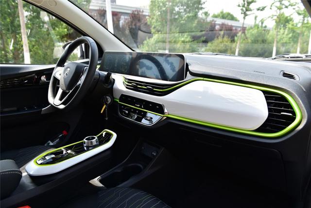 内饰是这一代新车的一个亮点,奔奔E-star拥有同级别最好的内饰,内饰配色采用白色和代表新能源的绿色装饰条,用料则是类似钢琴漆材质的塑料面板,手感非常润滑,前仪表台的双连屏已经是豪华品牌必备的配置,5万的小车拥有这种配置会让很多用户感到亮眼,而实际使用无论是反应速度还是显示效果都和几十万的车没有区别。