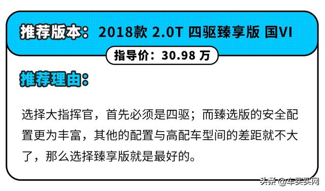 如果一定想入手吉普大指挥官,买买君推荐四驱臻享版。因为大指挥官国V、国VI版本均有售,那么首先排除国V版;其次要选择四驱版,买这样的硬派SUV,偶尔还是要去非铺装路面撒下野;最后是臻享版安全配置更高,并且并不比顶配少太多配置,没有理由不选择。